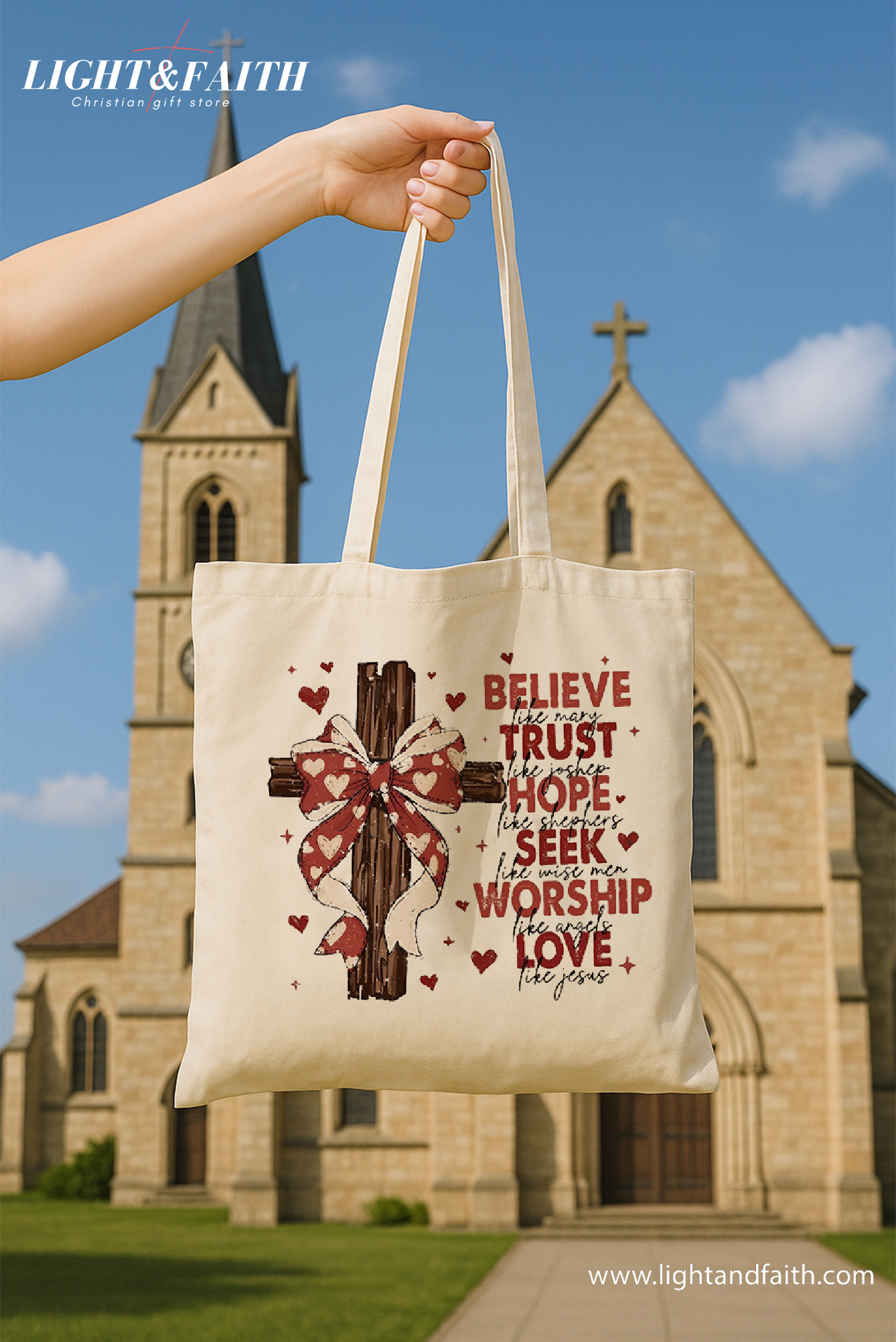 Coquette Christian Tote Bag – Bible Verse Canvas Tote – Aesthetic Jesus Tote – Floral Scripture Bag – Faith-Based Gift for Her – Reusable Church Tote TBLAF21