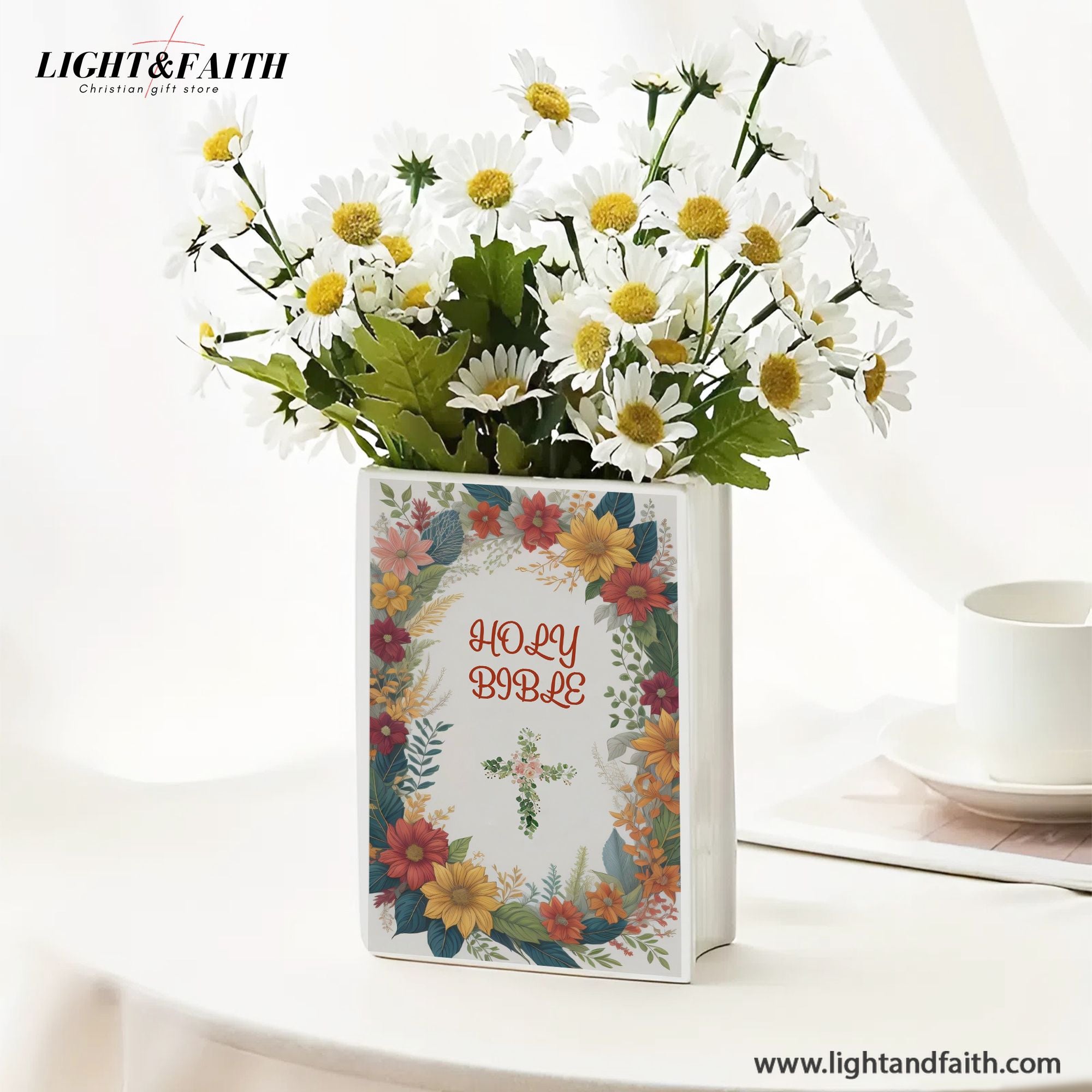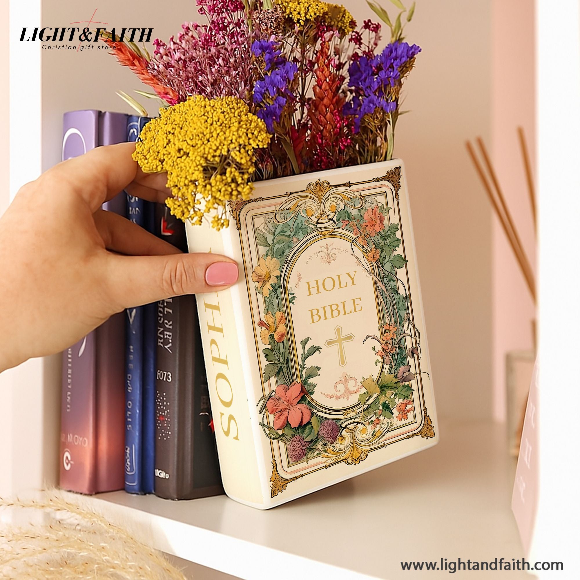 Personalized Holy Bible Book Vase, Christian Ceramic Floral Vase with Cross, Jesus Gift for Women, Christmas Gift Decor CBLAF01