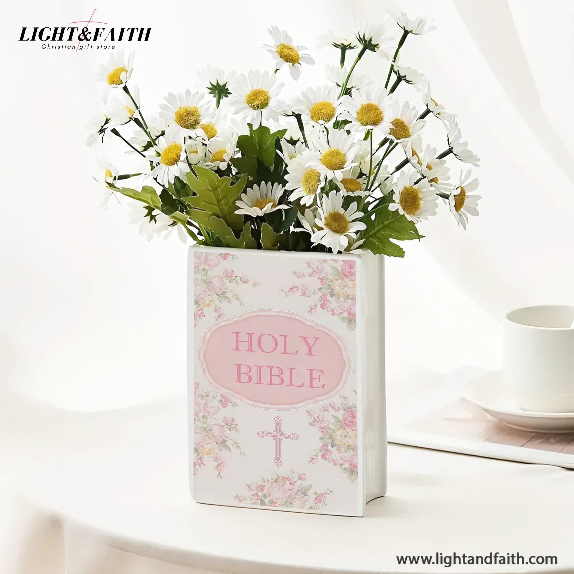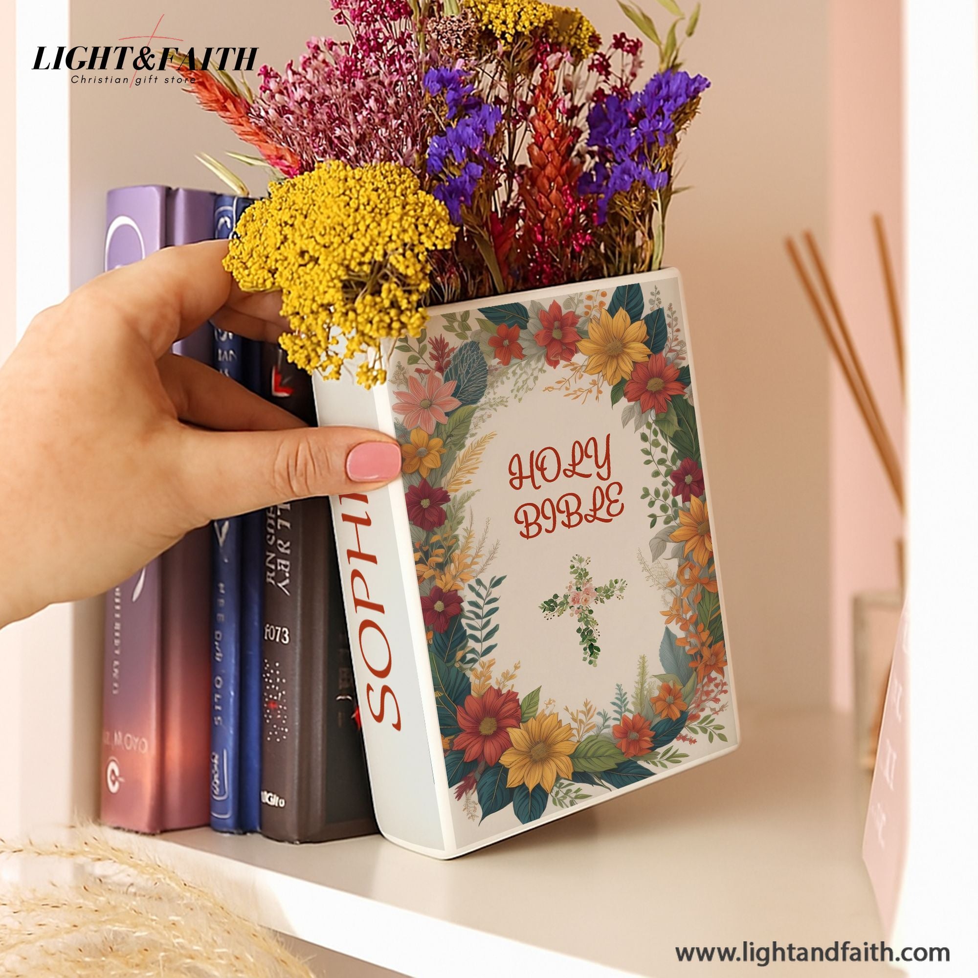 Personalized Christian Floral Book Vase, Custom Ceramic Holy Bible Book with Bible Verse, Gift for Girls & Teens CBLAF08