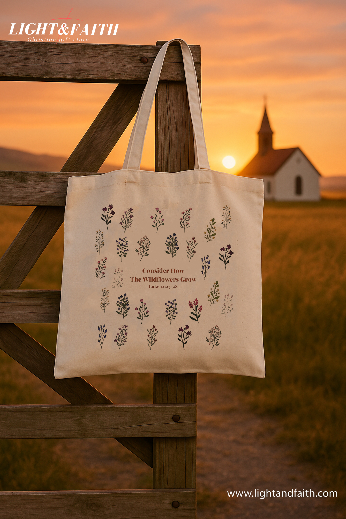 Consider How The Wildflowers Grow Tote Bag – Christian Canvas Tote – Bible Verse Bag – Religious Gift – Eco-Friendly Reusable Tote – Faith-Based Accessory TBLAF12