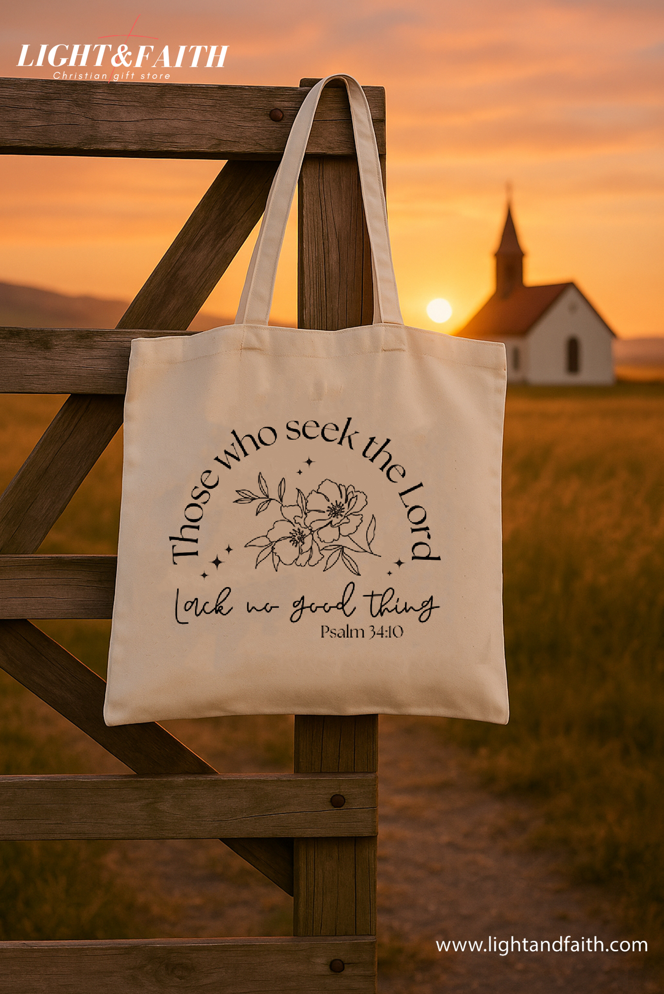 Psalm 34:10 Tote Bag – Those Who Seek the Lord Shall Not Lack Any Good Thing – Christian Canvas Bag – Bible Verse Tote – Faith-Based Gift – Church & Campus Bag TBLAF23