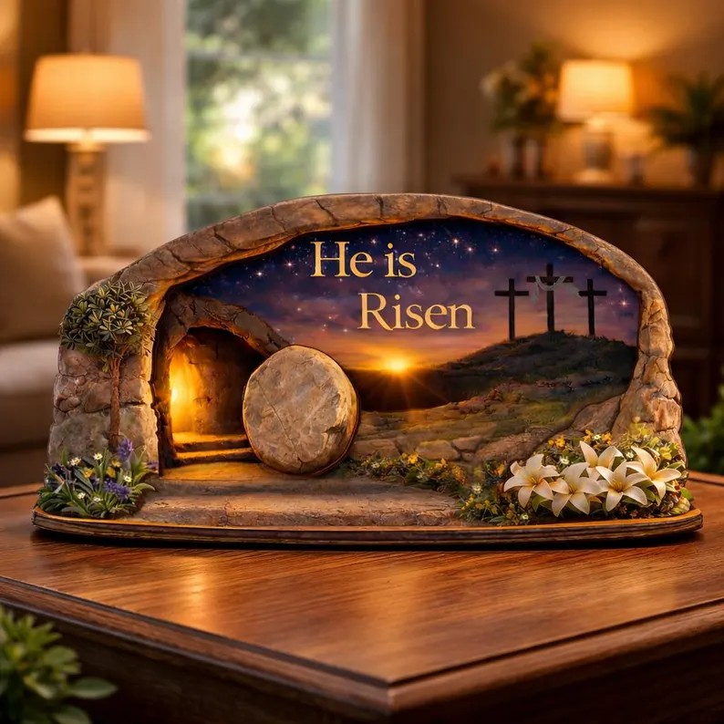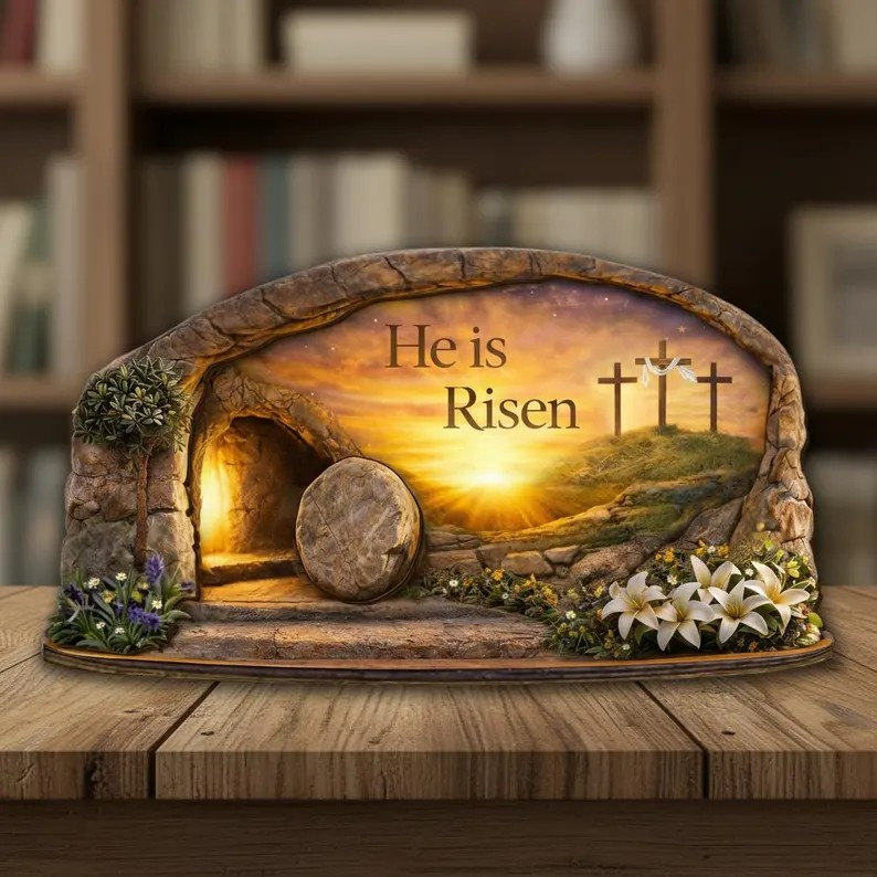 He Is Risen Easter Wooden Sign, Empty Tomb Resurrection Scene, Christian Table Decor, Religious Home Gift
