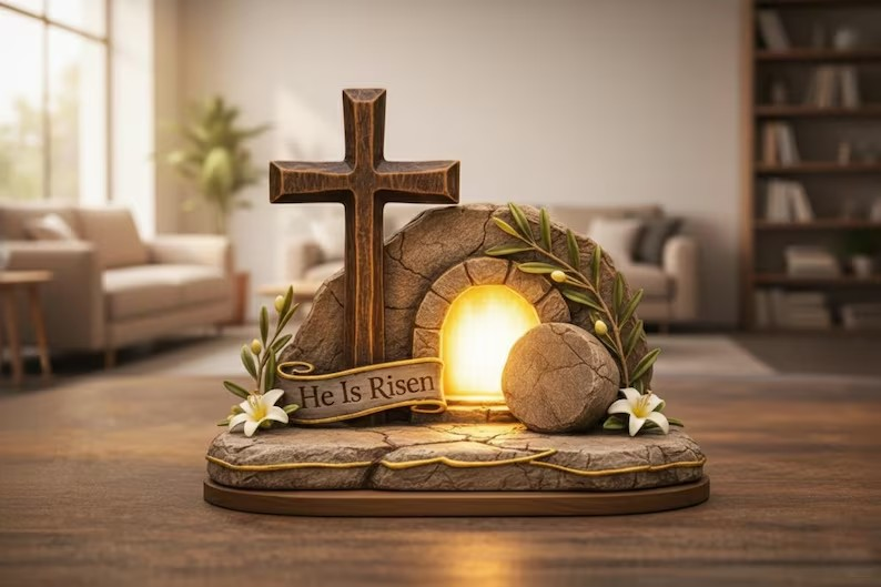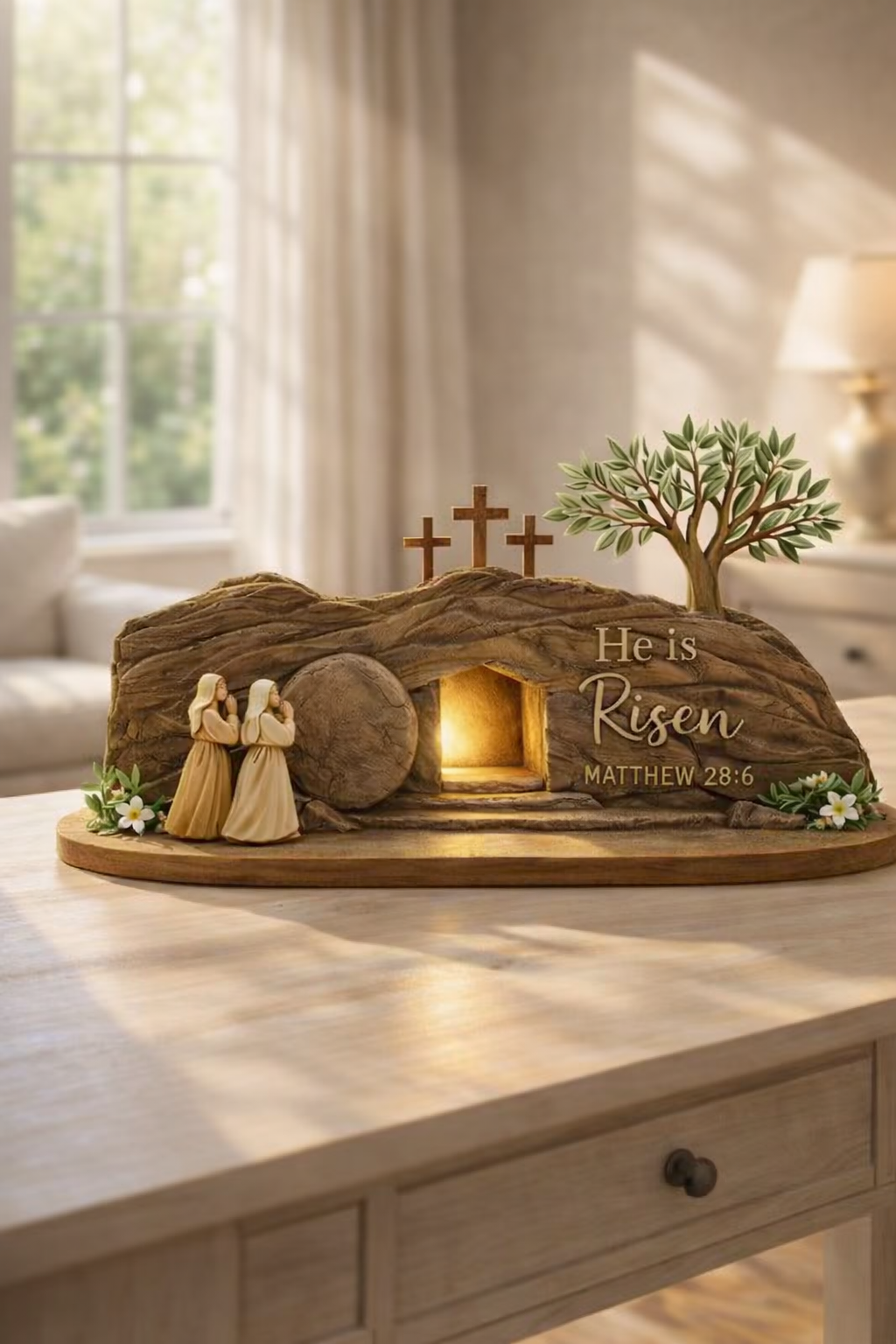 Christian Easter Table Decor, Empty Tomb Scene, Resurrection Display, Religious Wooden Sign, Faith Home Gift