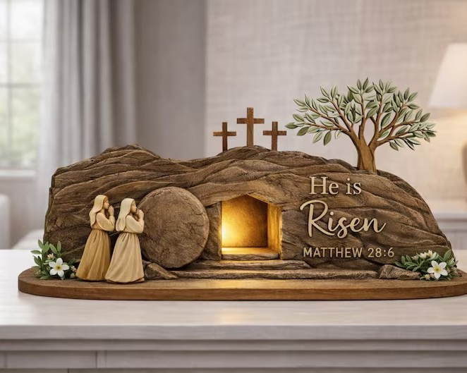 Christian Easter Table Decor, Empty Grave Scene, Wooden Resurrection Display, Faith Based Home Accent