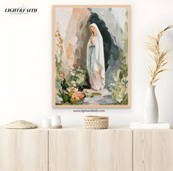 Our Lady of Lourdes Art Print, Virgin Mary Painting, Catholic Wall Art, Modern Christian Decor, Blessed Mother Gift for Her, Neutral Artwork