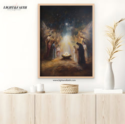 Nativity Poster Wall Art, Christian Christmas Decor, Holy Night Manger Scene Print, Religious Jesus Birth Artwork, Bethlehem Star Canvas
