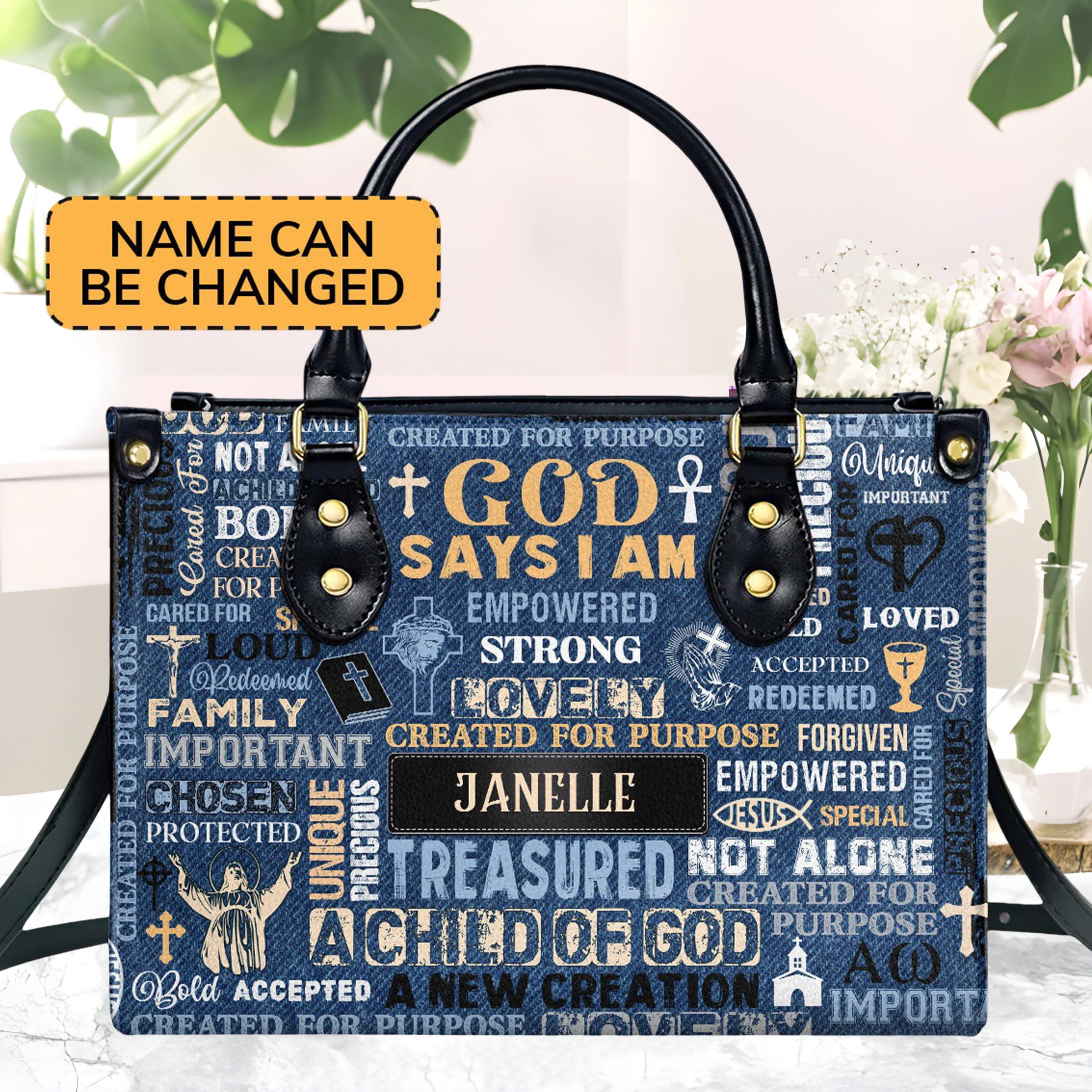 Personalized Christian Leather Handbag, God Says I Am Scripture Purse, Custom Name Bible Verse Tote – Faith Gift for Women BLAF51