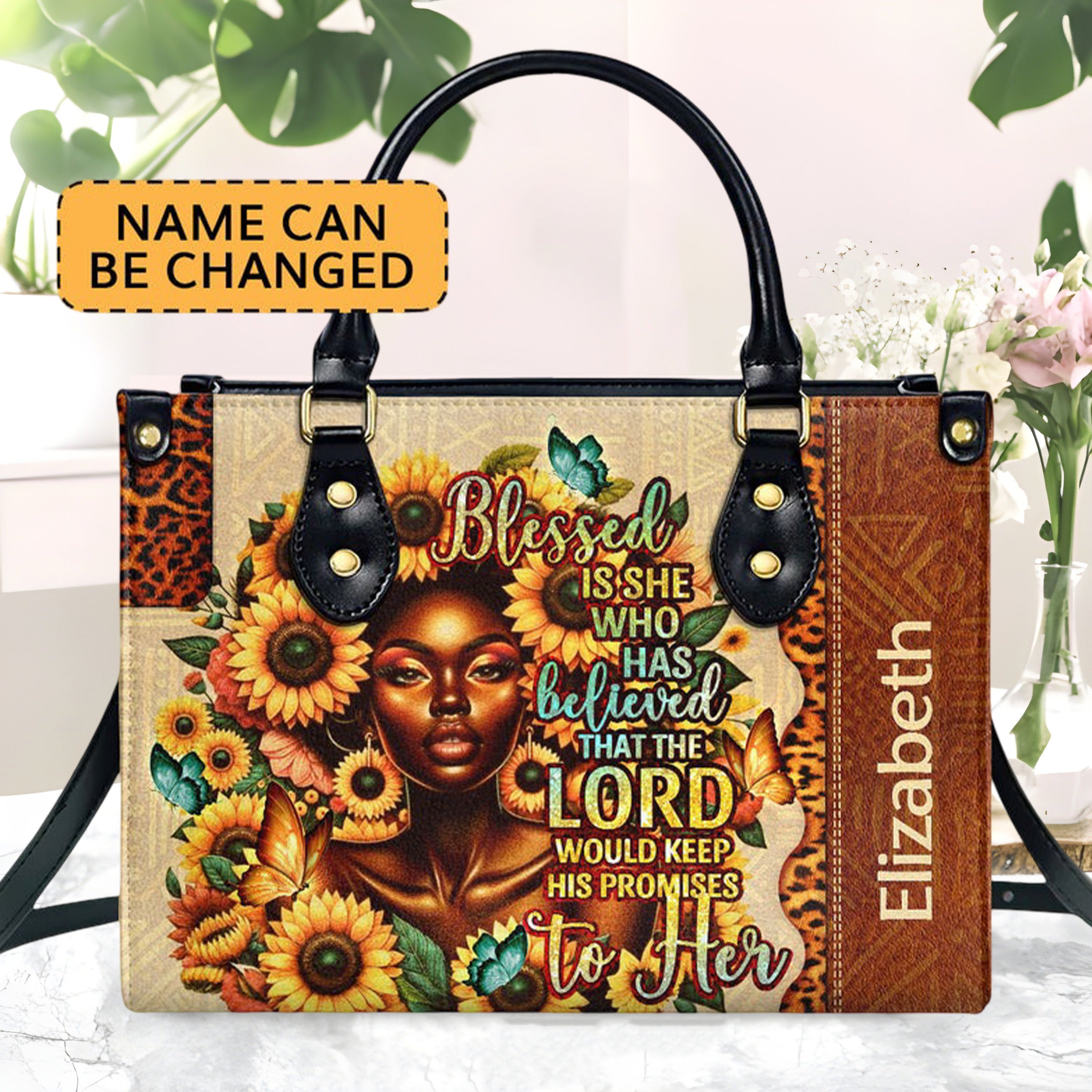 Personalized Christian Leather Handbag, Blessed Is She Who Has Believed Luke 1:45 Tote Bag, Sunflower Bible Verse Purse for Women of Faith BLAF44