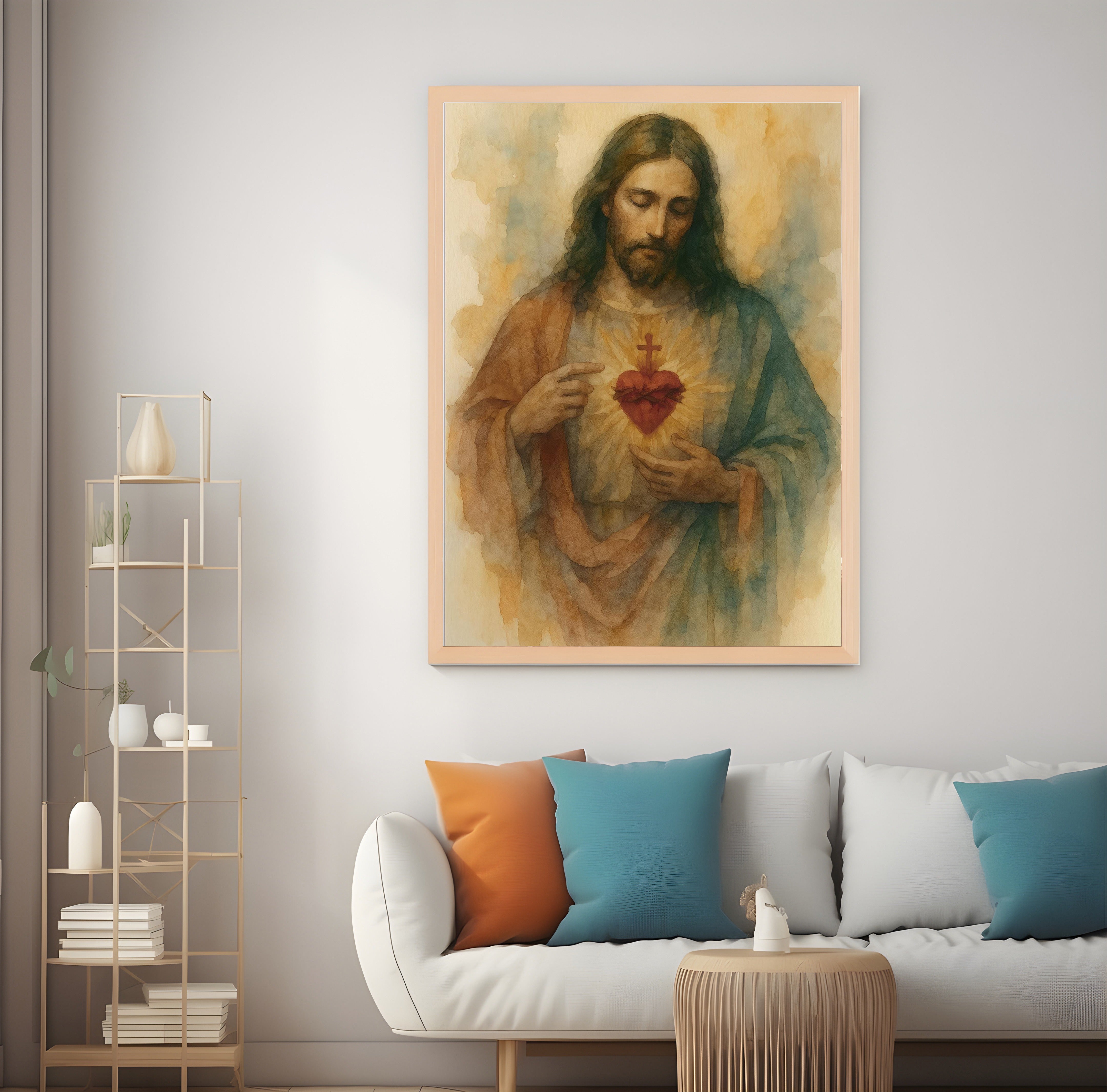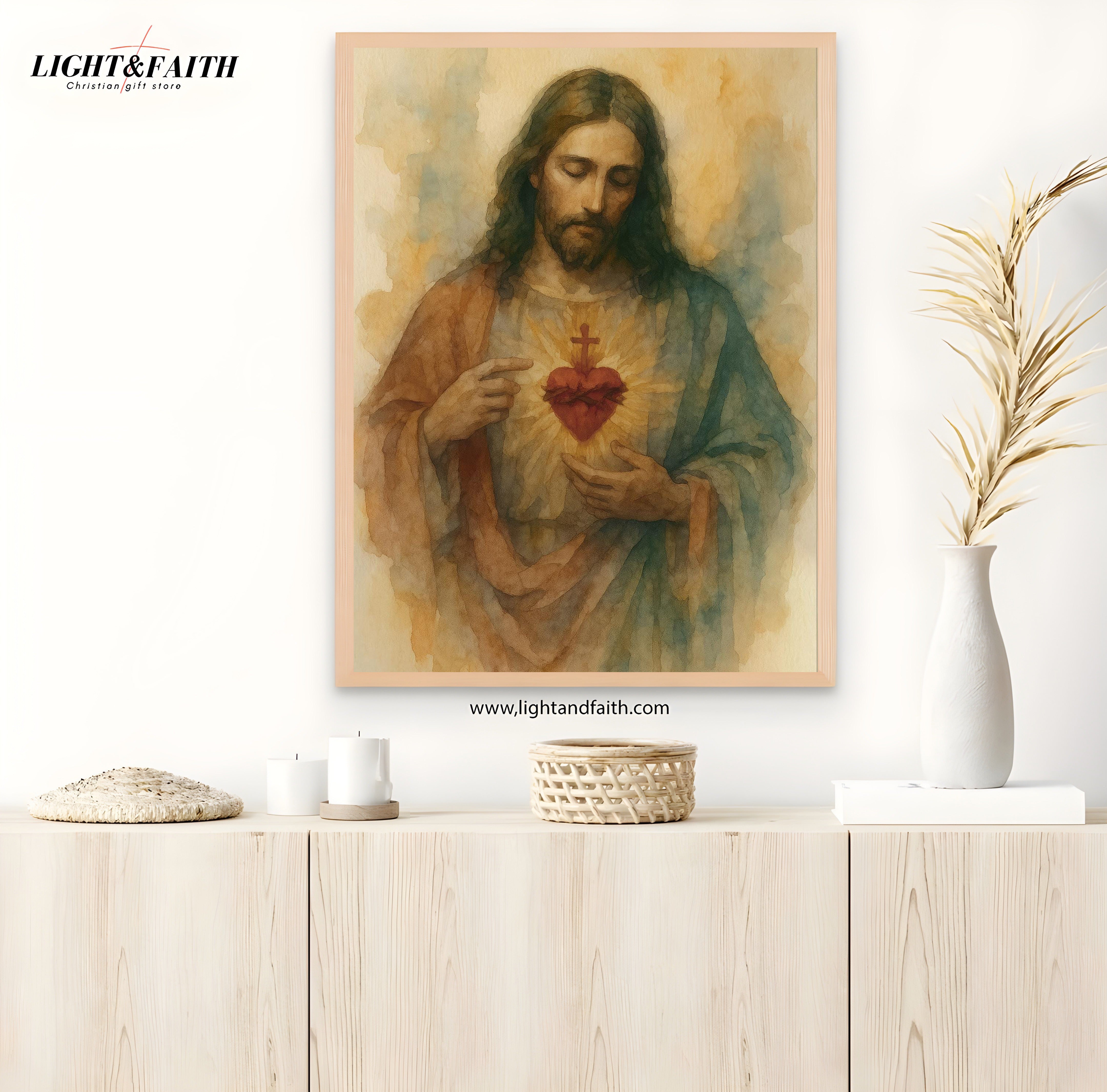 Sacred Heart of Jesus Christian Poster, Catholic Religious Wall Art, Modern Faith-Based Print, Devotional Watercolor Artwork, Christian Home Decor
