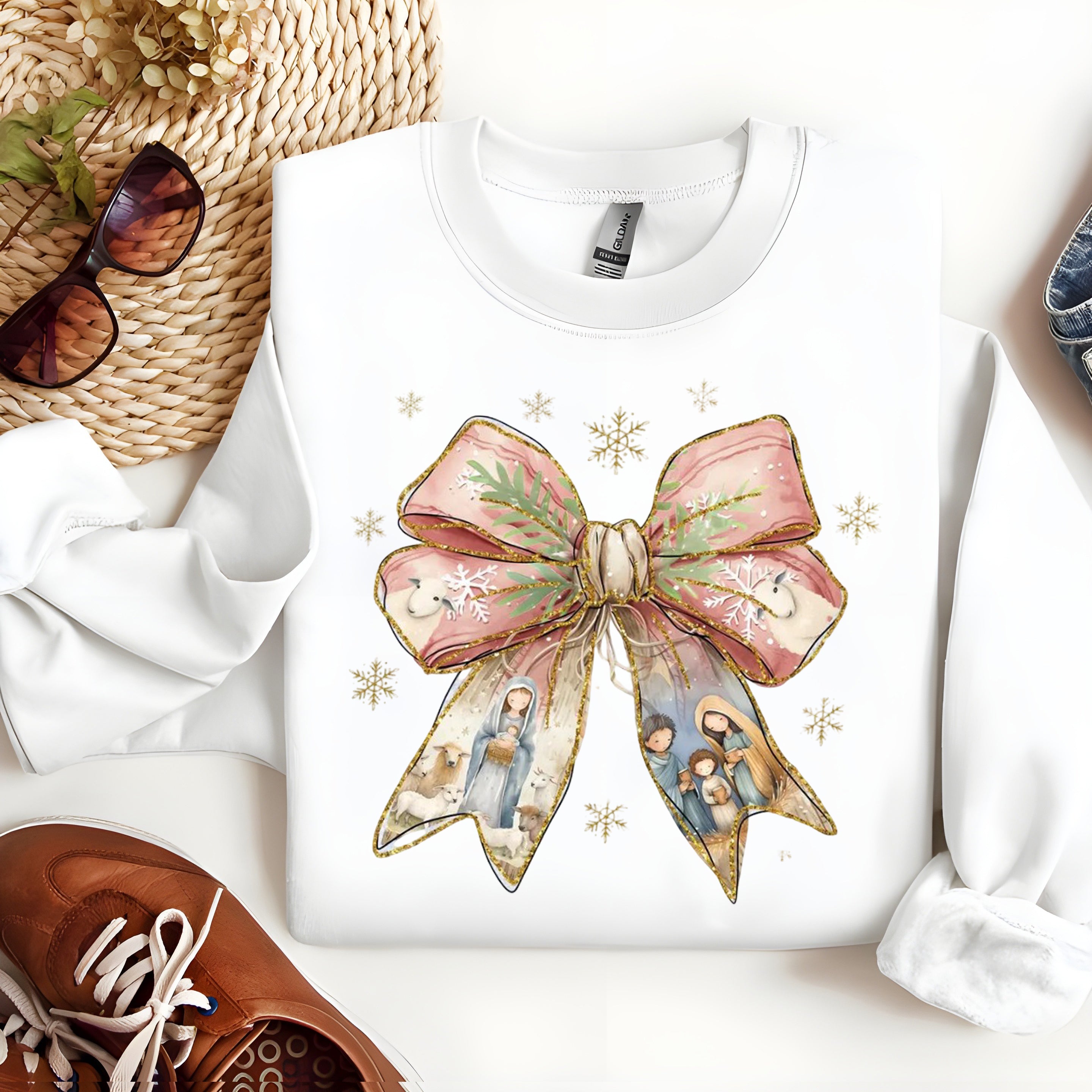Nativity Bow Christmas Sweatshirt, Christian Holiday Pullover, Religious Crewneck with Manger Scene and Festive Ribbon