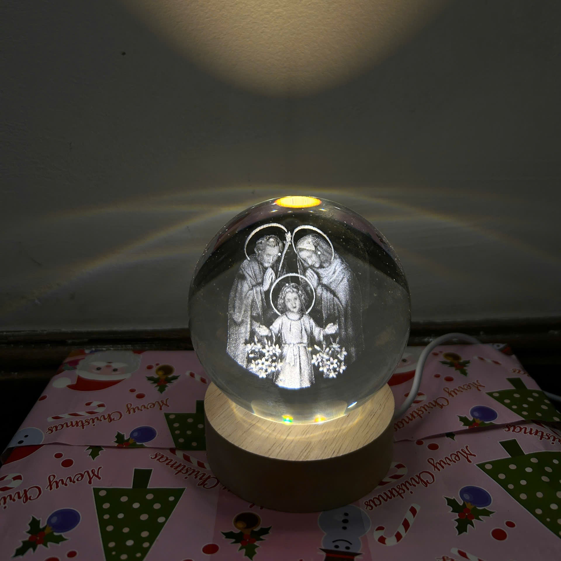 Bring the light of faith into your home with this stunning Holy Family Crystal Sphere, featuring an intricately engraved depiction of the Virgin Mary, Saint Joseph, and Baby Jesus. Perfectly paired with a wooden LED base, this piece creates a mesmerizing glow that enhances its beauty and spiritual significance.